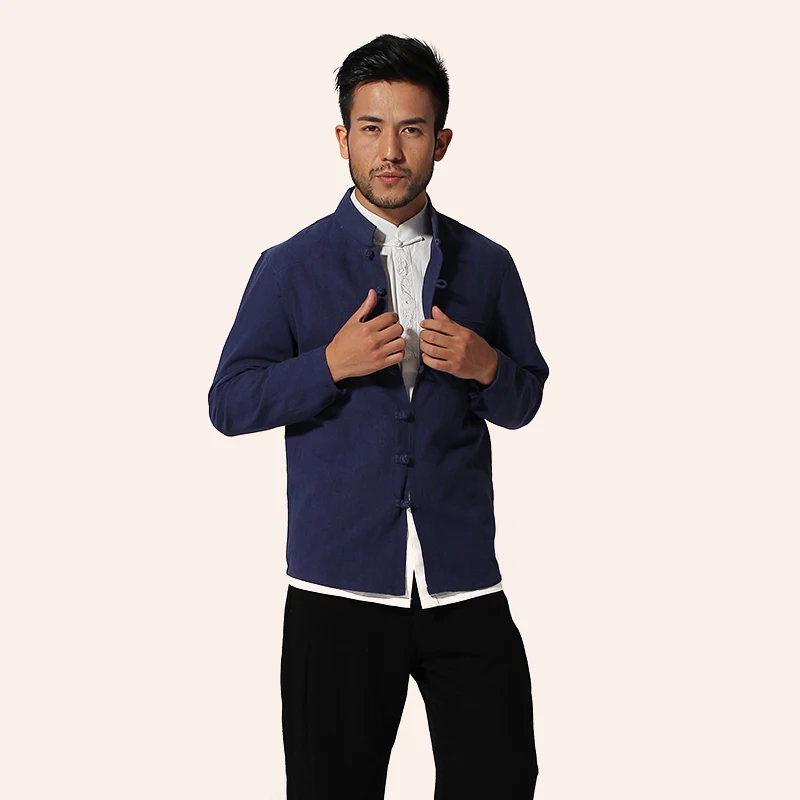 Blue Chinese Traditional Male Cotton Linen Jacket Men
